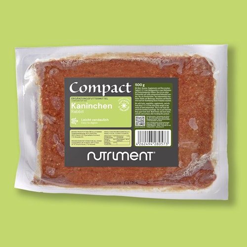 NUTRIMENT Compact Kaninchen ist ein fettarmes Frostfutter mit Kaninchenfleisch und Knochen, ideal für allergische Hunde zur natürlichen und proteinreichen Ernährung.
