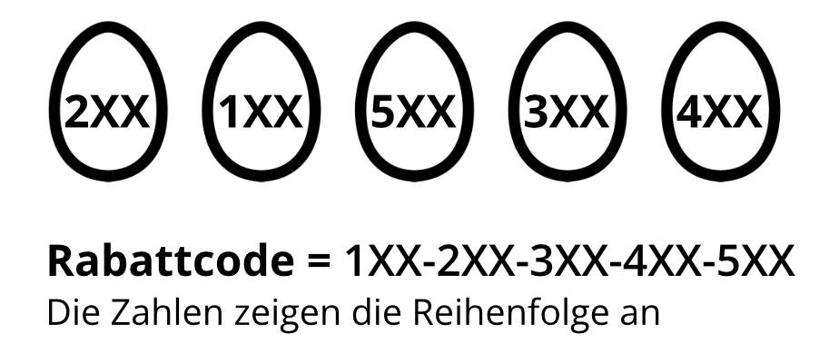 Sobald Sie fünf Eier mit jeweils unterschiedlicher Zahl am Anfang (1-5) gefunden haben können Sie den Rabattcode in der richtigen Reihenfolge eingeben und erhalten 10% Rabatt auf Ihren kompletten Einkauf. Der Rabattcode ist vom 2.4. bis 5.4. (Ostersonntag) gültig.