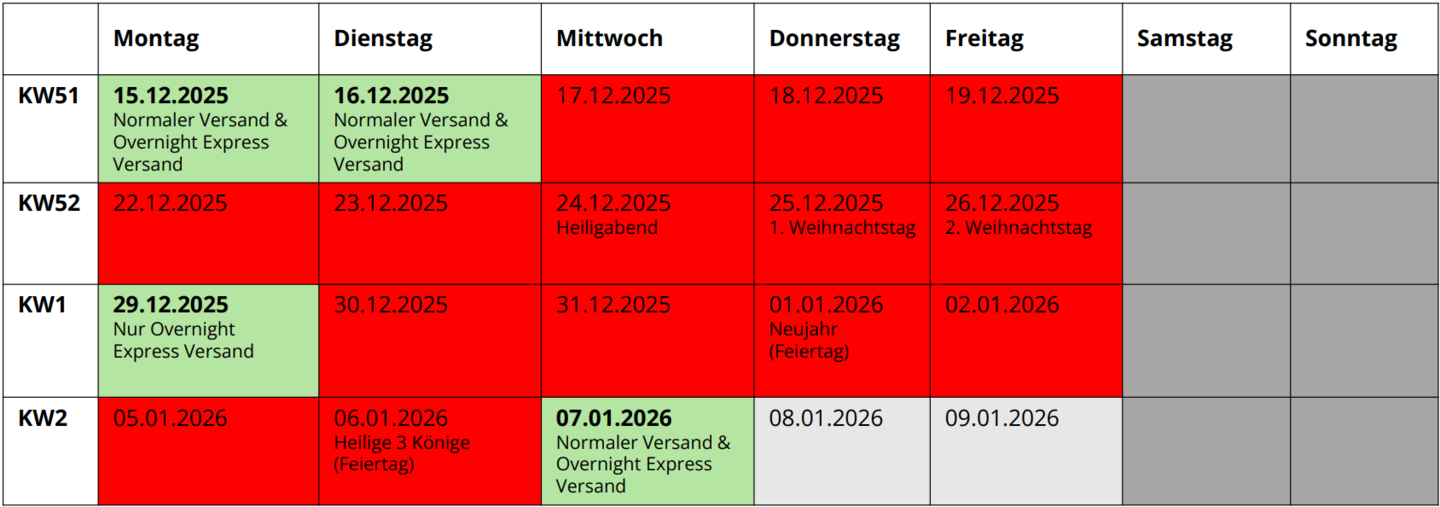 Der Versand erfolgt grundsätzlich nur montags bis mittwochs (außer an Feiertagen).
