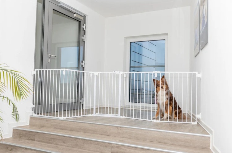 TRIXIE bietet ein 5-teiliges Hunde-Absperrgitter mit Tür, ideal für große Hunde, platzsparend faltbar und zur Wandmontage geeignet.