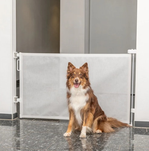 TRIXIE bietet ein stufenlos ausziehbares Absperr-Rollo für Haustiere, das als optische Barriere für Räume oder Treppen dient und platzsparend in die Halterung einziehbar ist.