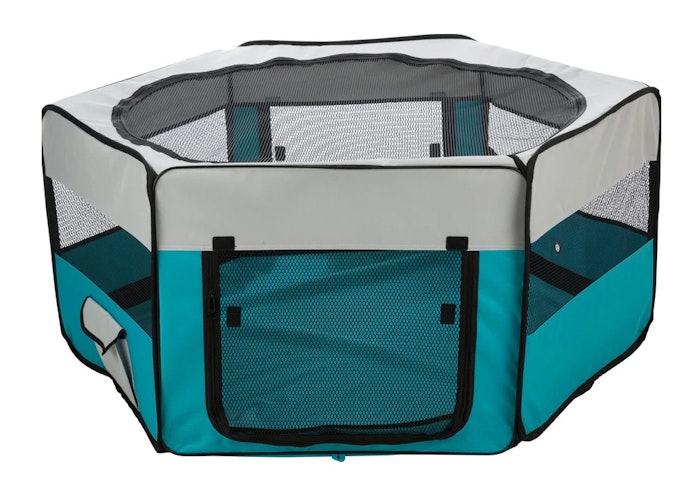 Der TRIXIE Freilauf aus Polyester für Meerschweinchen bietet eine Fläche von 130 × 55 cm in den Farben türkis und hellgrau.