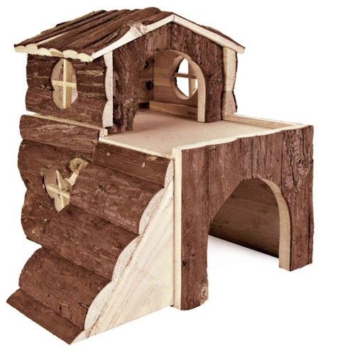 TRIXIE bietet ein zweistöckiges Hamsterhaus aus Rinden- und Naturholz mit Rampen für große Hamster, Maße 31 x 28 x 29 cm, braune Farbe.