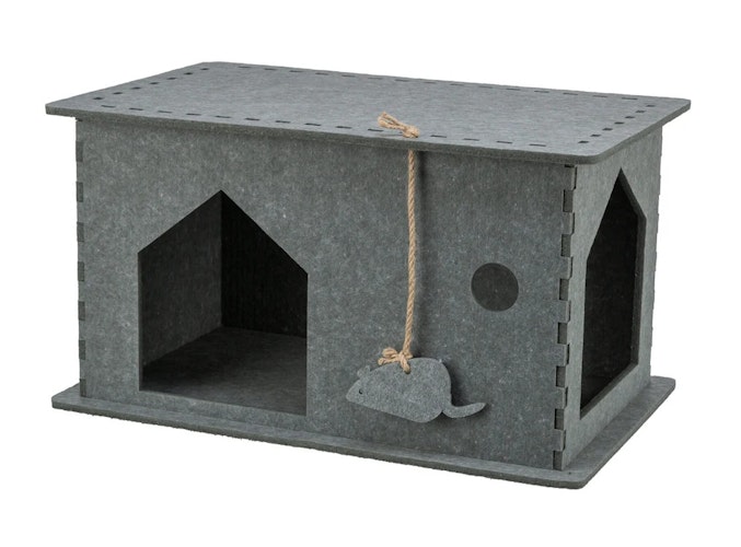 Die TRIXIE Höhle Lene aus formstabilem Filz bietet Katzen mit zwei Eingängen und Spielzeug einen gemütlichen, stilvollen Rückzugsort im eleganten Grau.