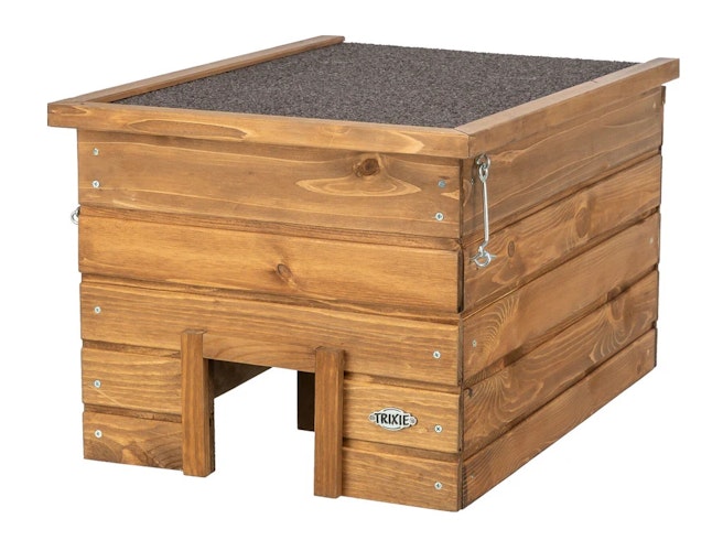 TRIXIE bietet ein Igelhotel aus lasiertem Kiefernholz mit ganzjährigem Unterschlupf, labyrinthartigem Eingang und witterungsfestem Dach als Bausatz an.