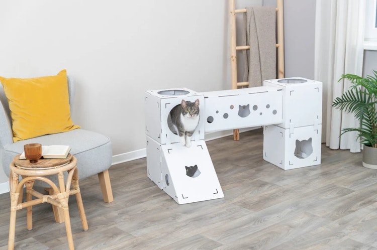 TRIXIE bietet modulare Katzenmöbel aus 100% recycelter Pappe, bestehend aus 4 Würfeln, 1 Tunnel und 1 Rampe, für Katzen bis 8 kg.